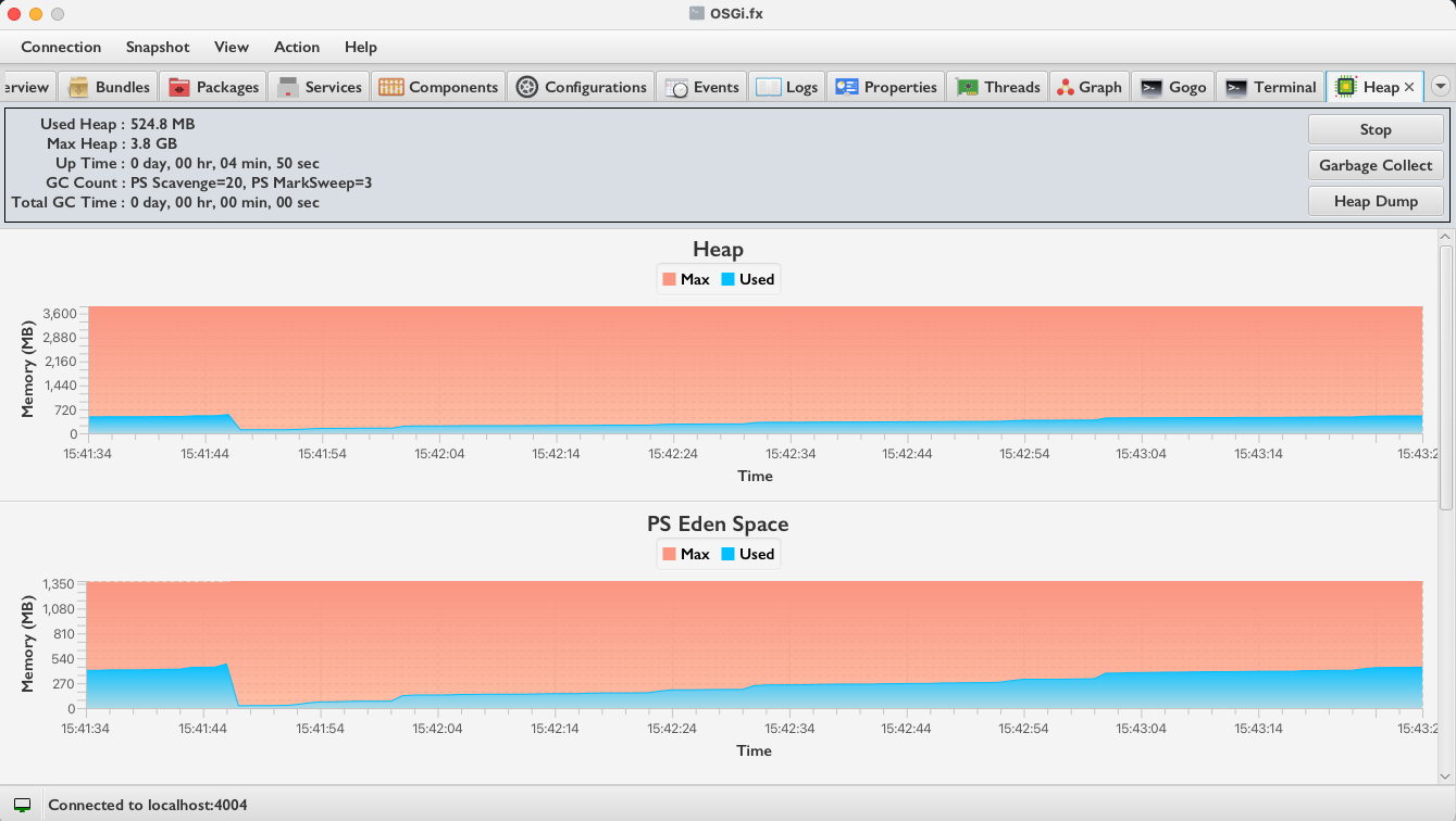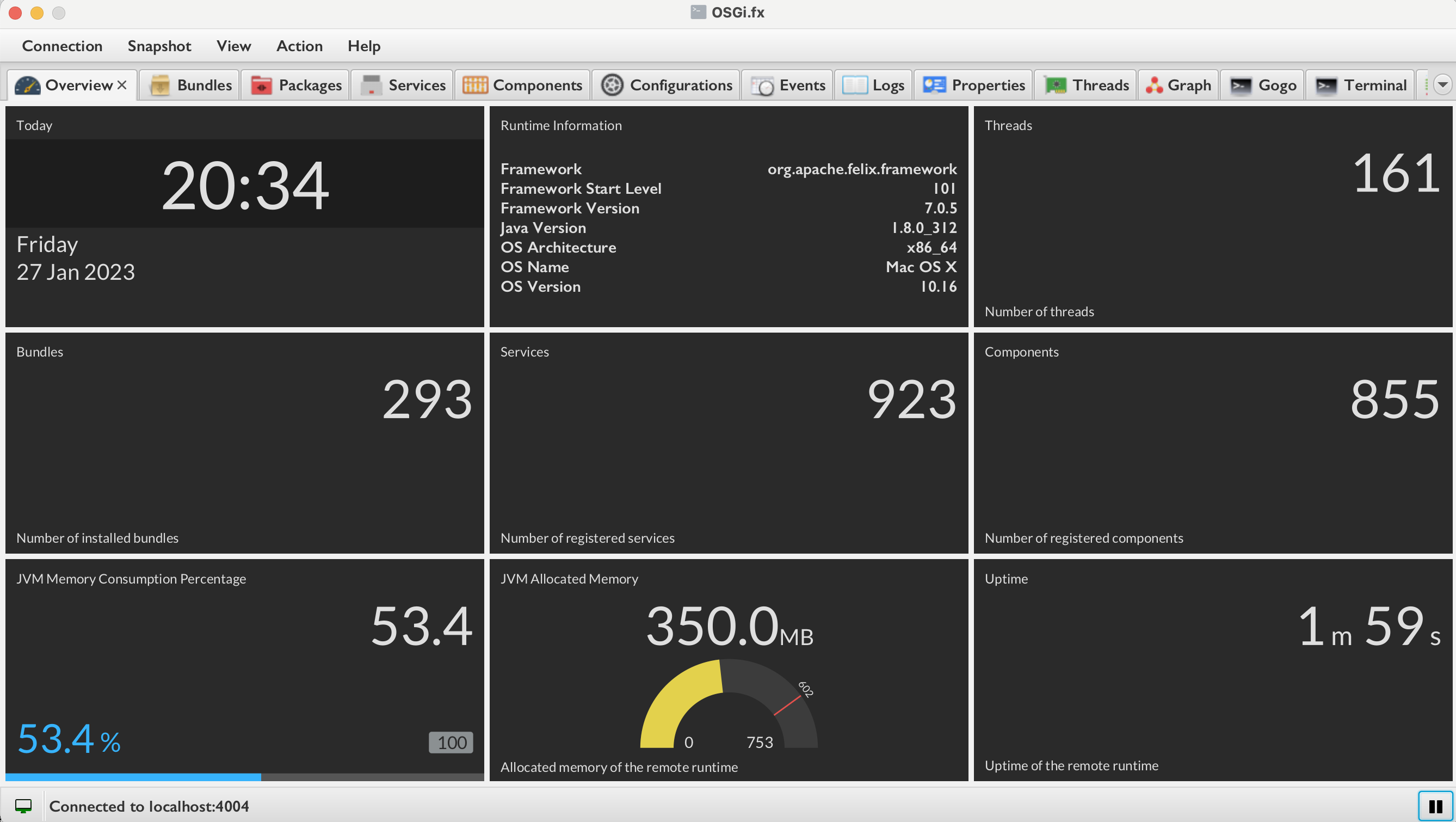| Overview of the remote OSGi framework (memory consumption, uptime, framework information, number of bundles, number of threads, number of services and number of DS components) | ![]() |