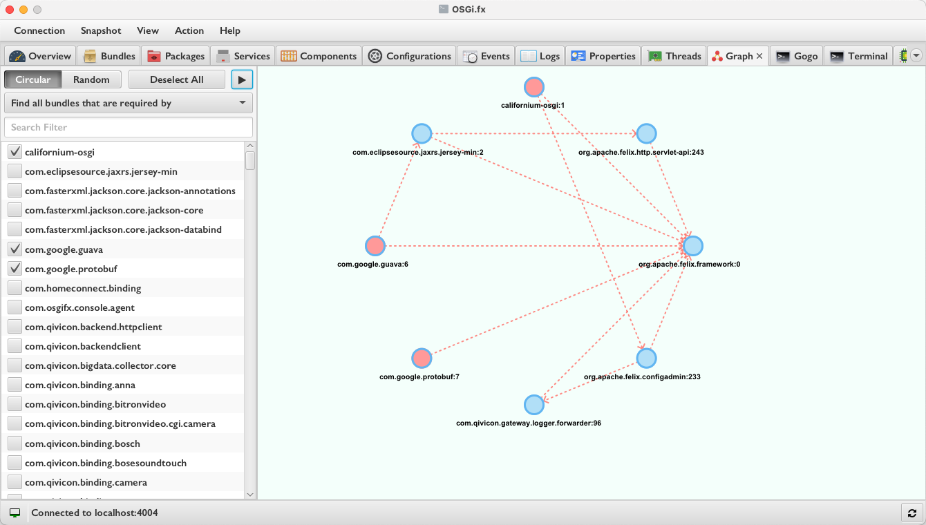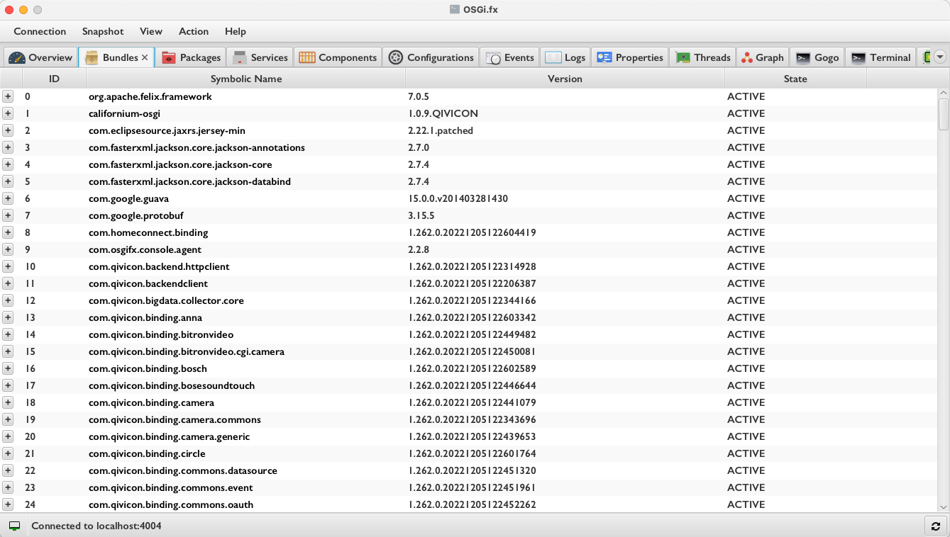 OSGi.fx is an easy-to-use application to remotely manage OSGi frameworks. Similar to Felix web console, this is an endeavour for desktop application users to provide all the necessary functionalities to remotely manage OSGi runtimes.