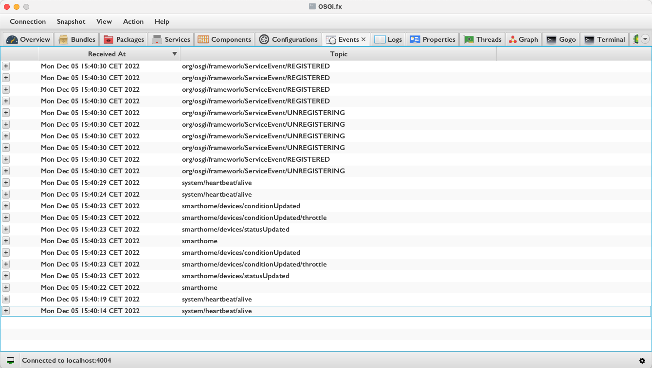 To use MQTT, you have to install the in.bytehue.messaging.mqtt5.provider.jar from OSGi Messaging. This project implements the draft OSGi messaging specification. Note that, you have to configure the in.bytehue.messaging.client PID in configuration admin for this library to work. You can find the relevant configurations in the project’s README. Also note that, you have to specify maximumPacketSize and sendMaximumPacketSize to 268435456 in the configuration. It denotes that the client will be able to send and receive packets of 256 MB in size. Note that, you have to download this JAR from Github Packages.
